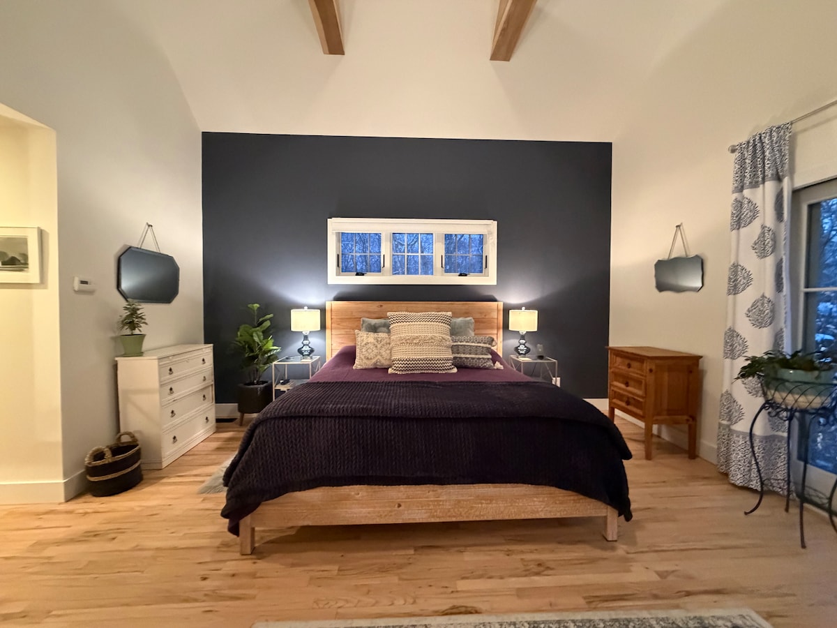 Beautiful, bright, spacious King suite w fireplace, two en-suite bathrooms & private separate poolside entrance. We are just minutes to beaches, boating, golf, hiking, biking, yoga and wineries. Play games, grill or cozy up fireside w a good book or movie. The space is creatively designed with a nod to natural elements and luxe comfort. Sleep your very best on our super deluxe king sized bed w/your choice of pillows. Complimentary coffee/tea/treats