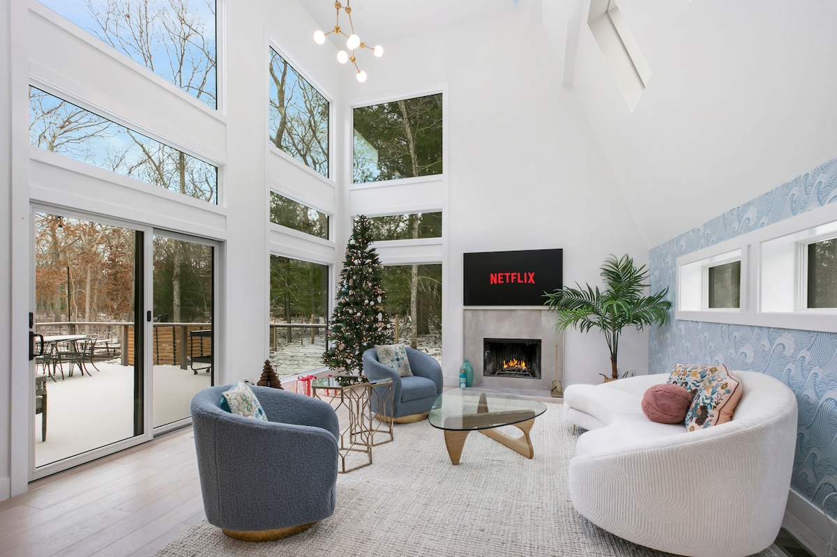 Come escape to your chic, serene Hamptons home set on a large piece of private property! The perfect getaway any time of year! Curl up @ the wood burning fireplace, cook in the large Chef's kitchen, enjoy 80' streaming TV. Spark up the firepit + BBQ; enjoy dining under the starry sky! During summer swim all day + lounge poolside/enjoy the outdoor area + privacy! Walk 1 block to the marina, stroll the neighborhood, enjoy restaurants, Main St., beaches, coffee shops all just 5-10 minutes away!