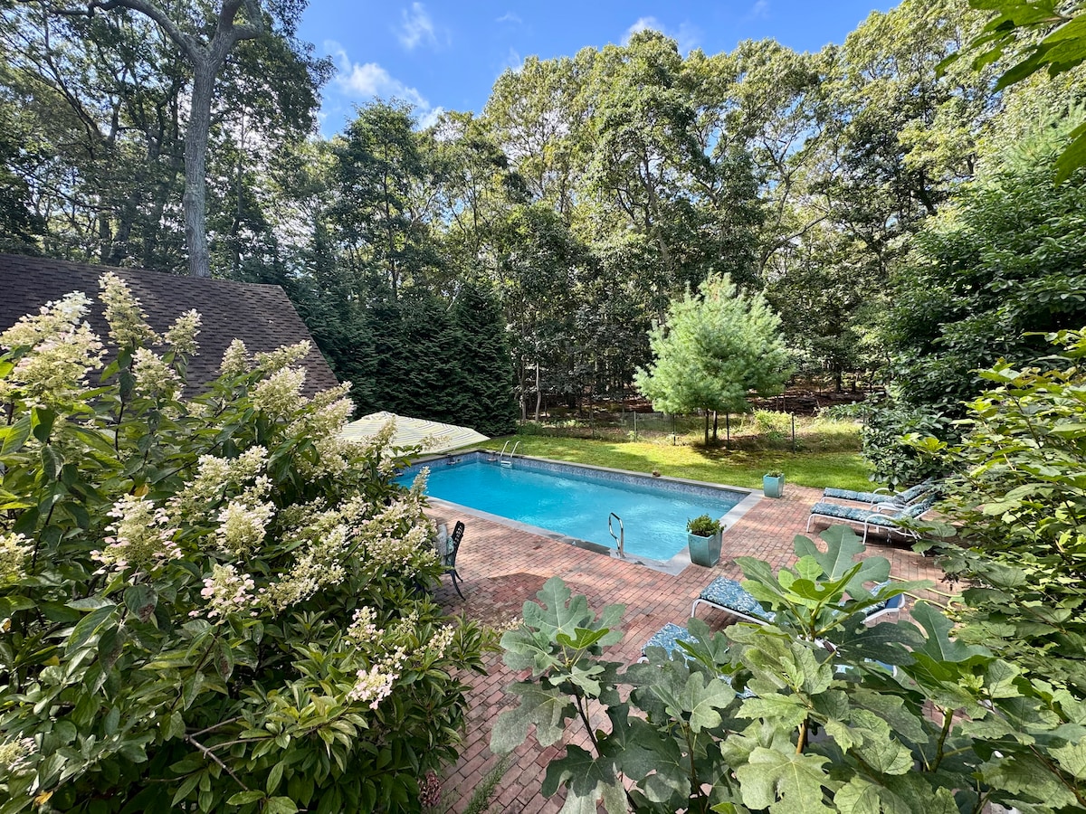 A beautifully landscaped tranquil oasis. Newly constructed private two bedroom, one bathroom guest extension to owner occupied house. Guests share large yard and pool with owner, and have private deck and seating area. Private entry and parking. Guest's may enjoy outdoor shower and BBQ. Please note there is no kitchen, however a small fridge, Keurig coffeemaker and microwave, plates/utensils are provided. Conveniently located to beaches, shopping and local restaurants in East Hampton.