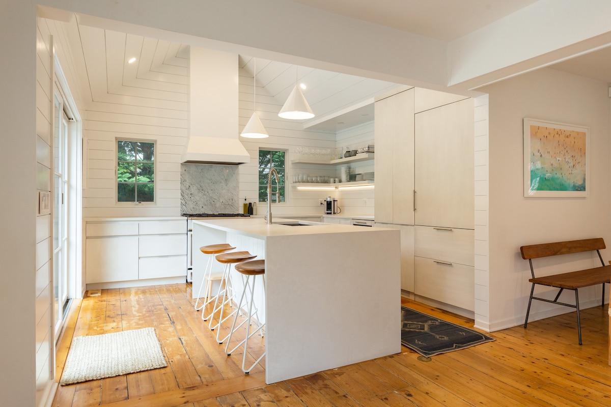 Escape to your serene, chic, private Hamptons home! You'll be nestled in nature yet near all of the best attractions. Curl up to the wood-burning fireplace, 80' streaming TV, cook in your fully stocked Chef's kitchen and enjoy the large book collection. Spark up the BBQ + firepit under the starry sky! You'll enjoy natural light + views from every angle! Take a stroll around the neighborhood, walk 1 block to the water. You'll be 3 minutes to beaches, Main St., cafes, restaurants + so much more!