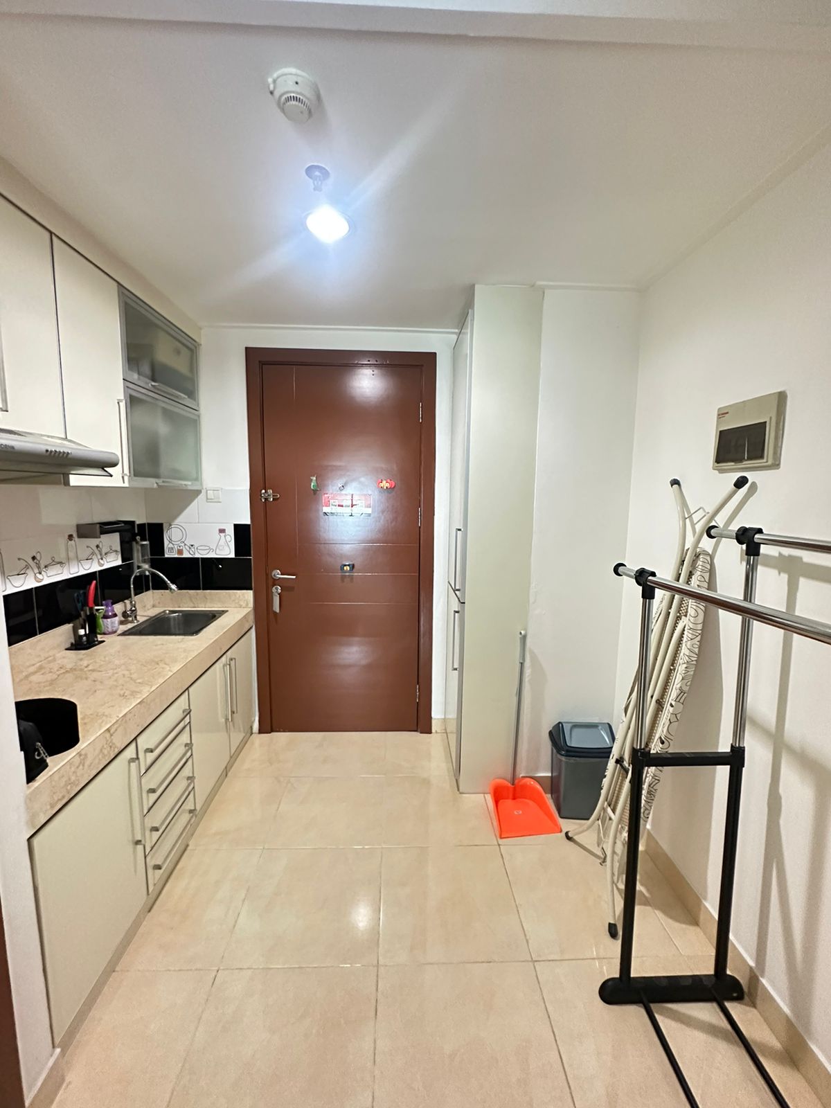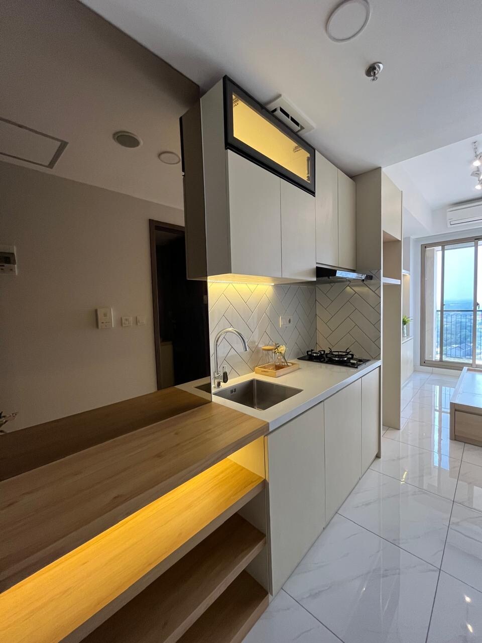 An elegant 24sqm studio in Jakarta's center, blending style and convenience. Includes kitchen, fast Wi-Fi, air-purification, 43" smart TV, sound system and Netflix. It is ideal for various stay types, with contactless access and amenities like pools, jacuzzi, gym, and basketball, Now features a Reverse Osmosis dispenser & food waste disposal, The picture shows a gas stove that has been replaced by an induction cooker (to follow the apartment guidelines for fire hazards)