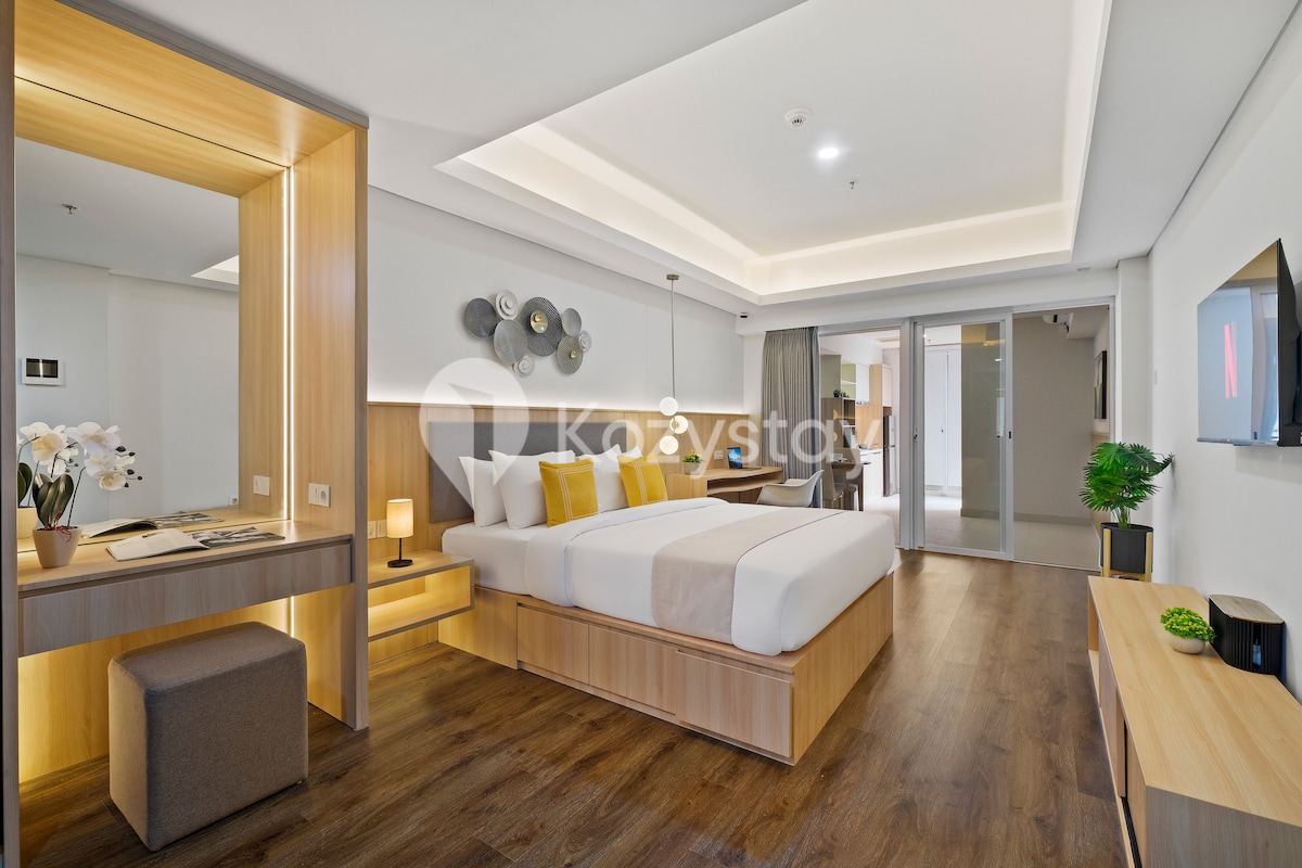 An elegant 24sqm studio in Jakarta's center, blending style and convenience. Includes kitchen, fast Wi-Fi, air-purification, 43" smart TV, sound system and Netflix. It is ideal for various stay types, with contactless access and amenities like pools, jacuzzi, gym, and basketball, Now features a Reverse Osmosis dispenser & food waste disposal, The picture shows a gas stove that has been replaced by an induction cooker (to follow the apartment guidelines for fire hazards)