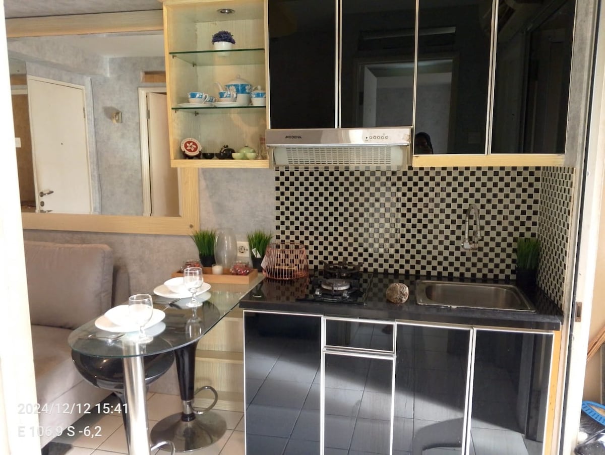 An elegant 24sqm studio in Jakarta's center, blending style and convenience. Includes kitchen, fast Wi-Fi, air-purification, 43" smart TV, sound system and Netflix. It is ideal for various stay types, with contactless access and amenities like pools, jacuzzi, gym, and basketball, Now features a Reverse Osmosis dispenser & food waste disposal, The picture shows a gas stove that has been replaced by an induction cooker (to follow the apartment guidelines for fire hazards)