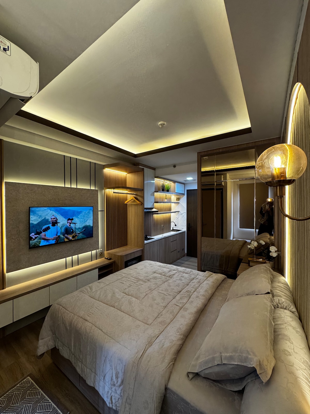 Μοντέρνο στούντιο, με έξυπνη και εργονομική διακόσμηση ώστε να αποδώσει τα μέγιστα ο χώρος! Ο χώρος διαθέτει queen size κρεβάτι και μεγαλο καναπέ. Η κουζίνα είναι πλήρως εξοπλισμένη. Το μπάνιο ανακαινισμενο με παροχή ζεστού νερού κσι νιπτήρα. Παρέχεται πρόσβαση σε τρεις πισίνες,μια μεγάλων διαστάσεων για ενήλικες και δύο μικρότερες για παιδιά, του συγκροτήματος. Επίσης υπάρχει ελεύθερη πρόσβαση στο γυμναστήριο και στη σάουνα στο ισόγειο . Το κέντρο της Τζακάρτα απέχει 5-6klm .
