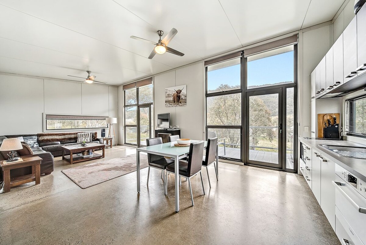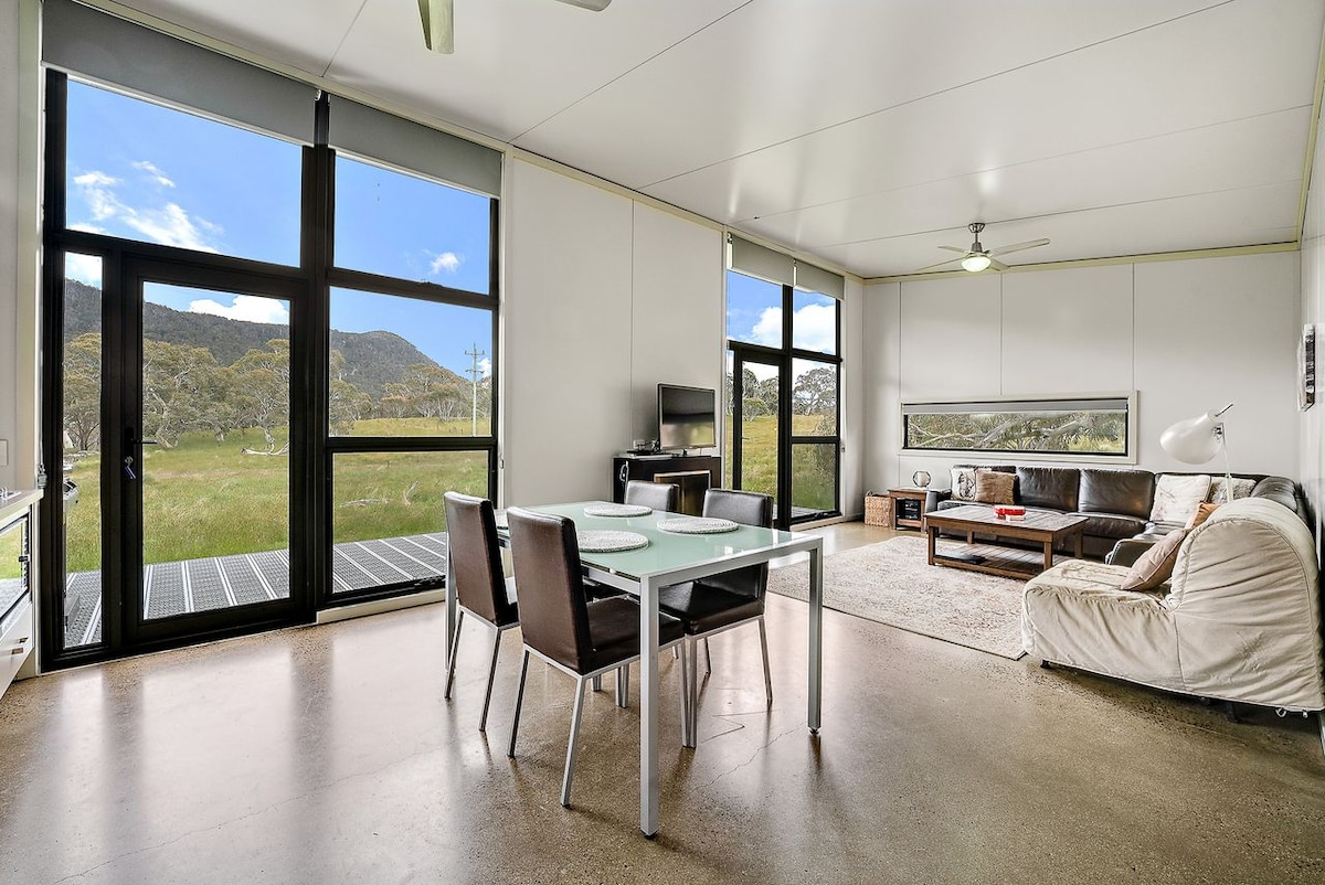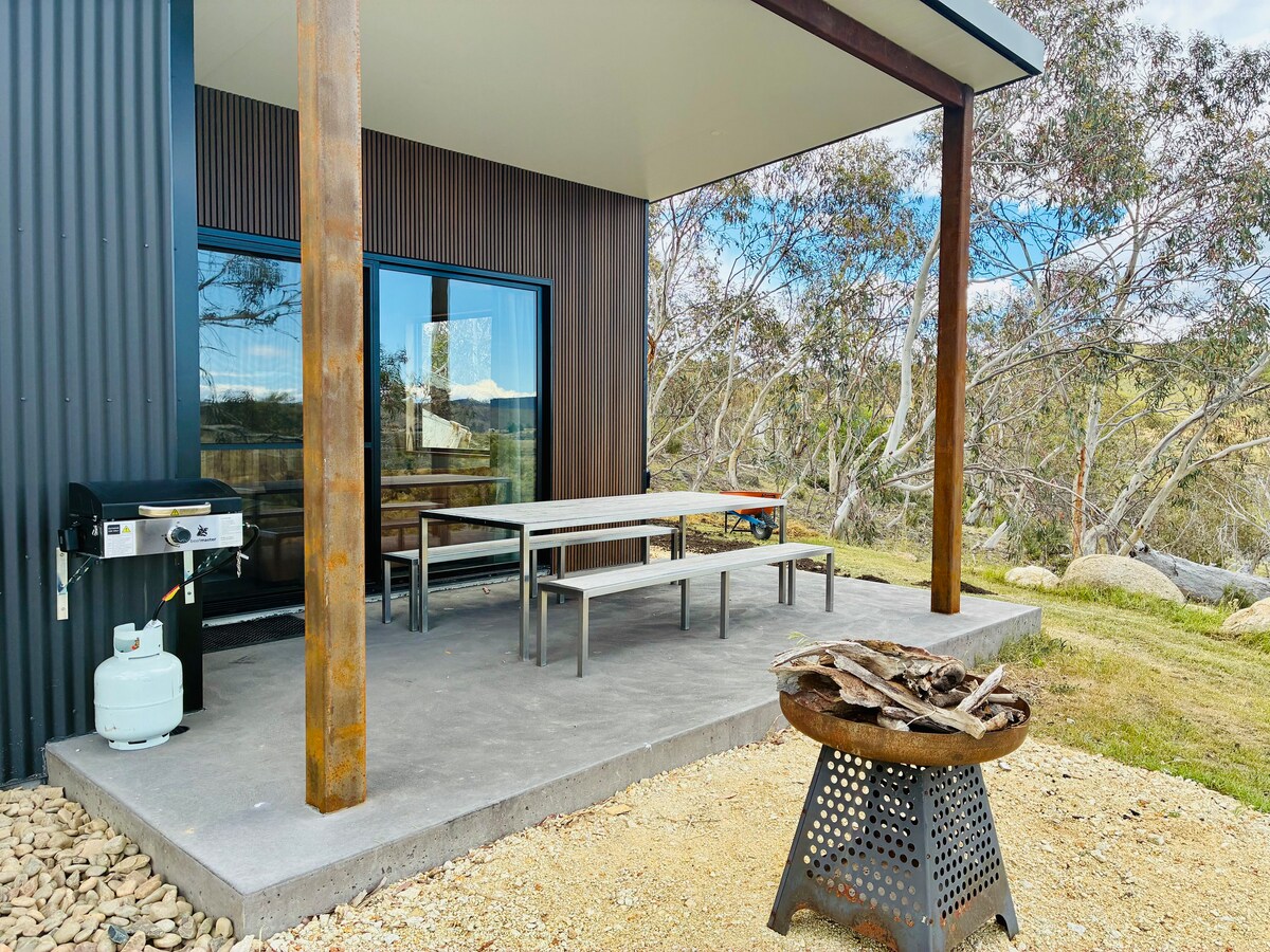 Brand NEW Eco chalet 'The Raven' perched high on the hill with stunning vistas from every window. Only 7km drive to Jindabyne town & 35 mins to snowfields. 50 acres to explore with abundant wildlife, beautiful old Candlebark trees, granite boulders and native grasses. 500m of Mowamba River access where platypus and trout abound. Peaceful and private with glorious sunrises and sunsets. Perfect base for your skiing/ snowboarding, mountain biking, fishing or hiking holiday. Relax, unwind, recharge.