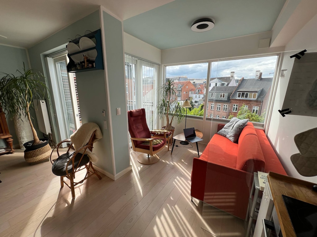 Flot og rummelig lejlighed i skønne Mejlgade. Beliggenhed i Aarhus C med gåafstand til gode restauranter, indkøbsmuligheder, parker, Aarhus Ø og en masse forskellige attraktioner. Lejligheden er designet med store vinduer, som giver et naturligt lys. Den er udsmykket med store billeder, spejle, planter m.m. for at skabe en hyggelig stemning. Perfekt til kæresteparret, familien, eller en gruppe på op til 4 personer (5 hvis en person sover på sofaen - skriv en besked hvis dette er nødvendigt).
