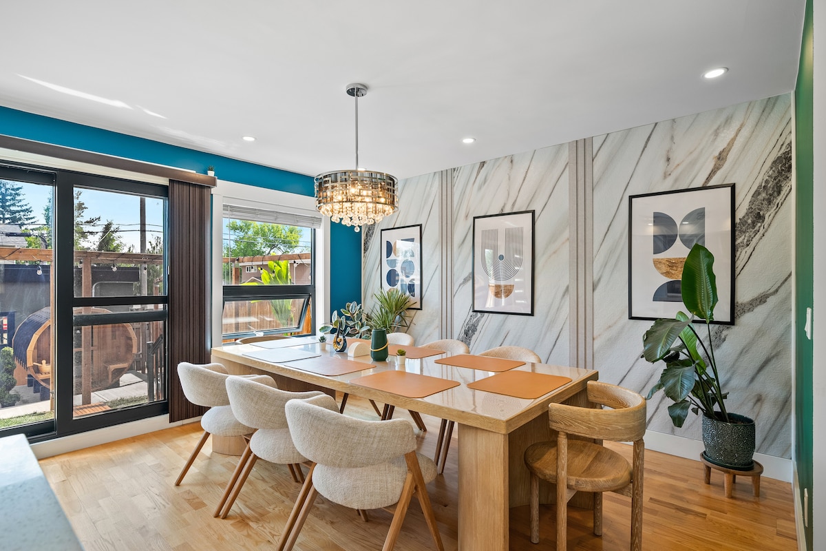 Air-conditioned 5-Star luxury minutes to the City Centre and downtown! Enjoy a king suite, a CUSTOM sauna, private media room, fast Wi-Fi and free garage parking. Gather in the Bosch chef’s kitchen, stream on twin 55-in TVs or relax with family by the backyard fire table & BBQ. King, 2 Queens and 2 Twins, ideal for family and group stays. Nespresso bar Complimentary wine Patio with Edison lights Private laundry Minutes to Marda Loop shops and 17th Ave SW Housekeeping & Private Chef available