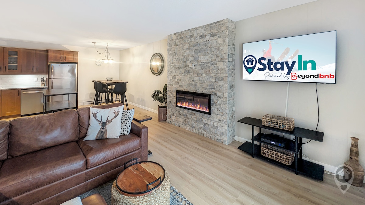 Welcome to Mountainside: The Suite. A boutique-style condo nested against the Purcell mountains with access to kilometres of forested area for downhill skiing, hiking and trail running. Suite Highlights: - Mid-century meets Scandinavian design - Spa-like walk in shower - Cozy fireplace to warm up after a day spent adventuring - Walking distance to Kimberley Alpine Resort and Trickle Creek - Across the street from the Nordic Club - Minutes drive to the Kimberley's downtown "Platzl"