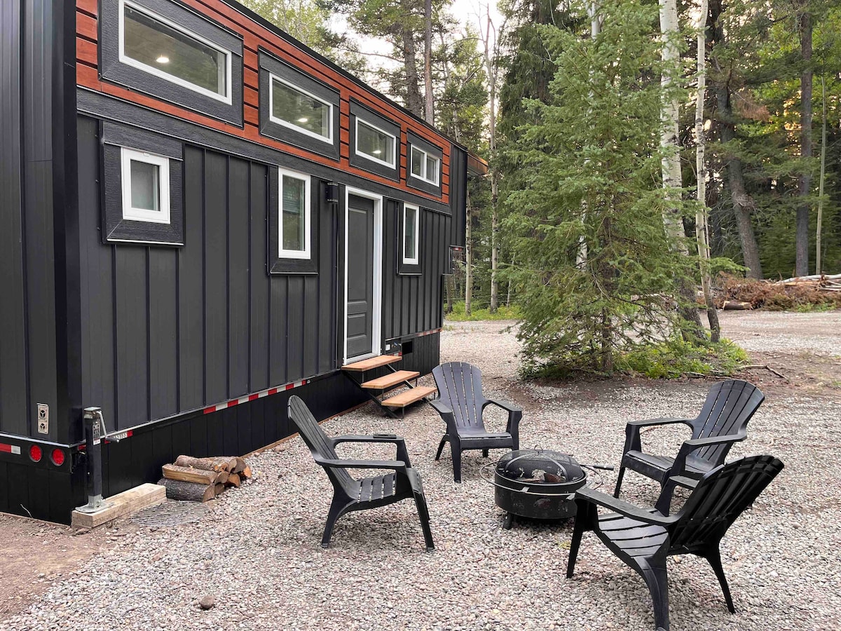 Experience the charm of a modern rustic retreat in this new cozy tiny house, tucked into a peaceful wooded setting. Enjoy the simplicity of tiny living while still being close to nearby cabins and amenities. Gather around the real wood fire pit just steps from your door, and don’t miss a visit to Frank Slide, only minutes away. - Master bedroom with Full XL Bed - Loft with Double Bed - Living Room Futon **Inquire about staying 7+ days as Sundays are not always booked, even if blocked.