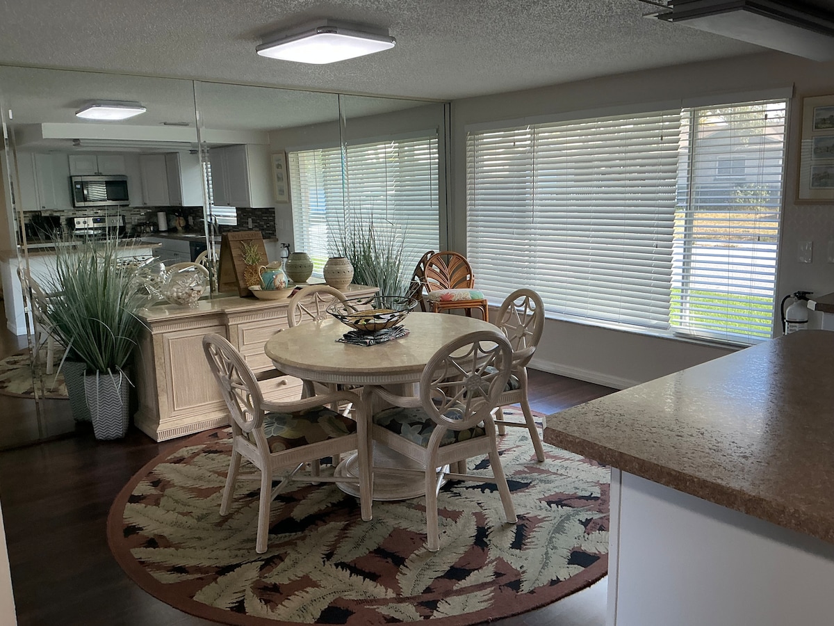 Our home is beautifully updated, fully furnished and decorated in a beach theme. The master bedroom has a comfortable king size bed and the second bedroom has a queen. We have a beautiful pond in the back. Perfect for you to relax and BBQ while enjoying our wonderful Florida weather. The house has a Smart TV, Internet w/Wi-Fi, dishwasher, washer, dryer, and much more. Everything you need to make your stay perfect. We are close to great shopping, dining and to some of Florida's best beaches.