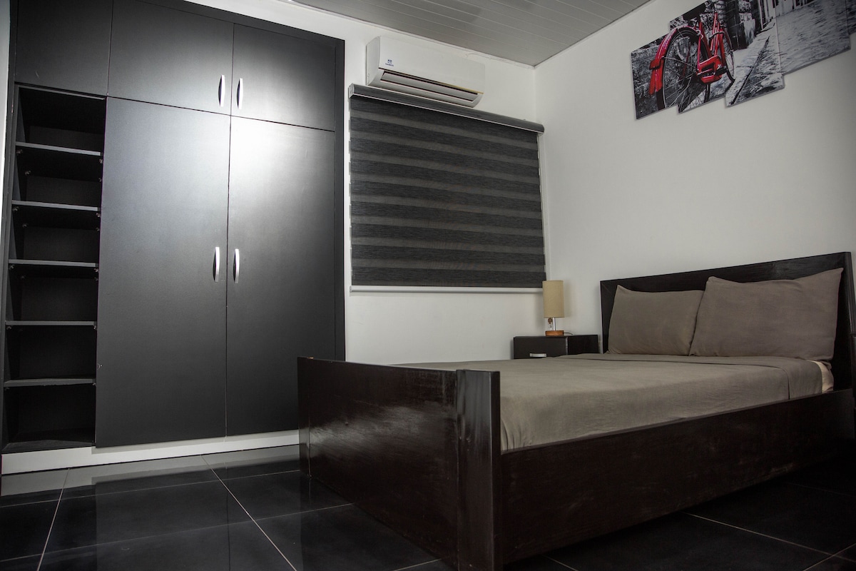 This apartment is located within Mariville Homes Estate, a gated residential community off Spintex Road, near Manet Junction. Conveniently situated just a 15-minute drive from the airport, the property offers a secure and serene environment. The estate is gated and monitored 24/7 by private security, ensuring controlled access. The apartment features two bedrooms and can comfortably accommodate up to four guests. Both bedrooms are en suite and feature queen-size beds.