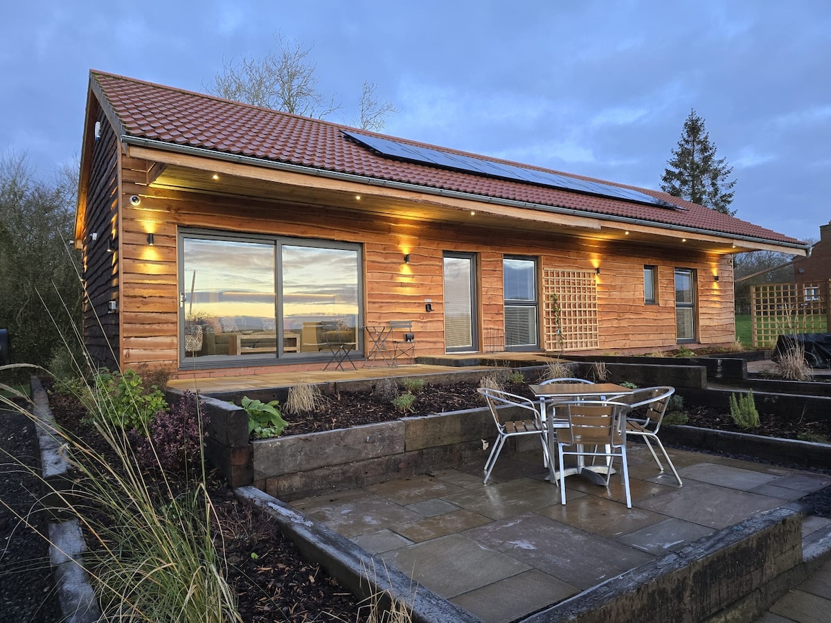 Forget your worries in this spacious and serene space. A new custom-built cottage with Air Conditioning, Oak furniture, a new Oak bed and kitchen, and a great bathroom. We finished building in June 2022, so be one of the first to enjoy it. It is an EPC A-rated eco-build. In a secluded orchard accessible by a country lane with minimal passing traffic, a tranquil, peaceful location. New hot tub Jan 2023, Sauna and steam room installed July 2023 We are pet friendly, but land is hedged not fenced.