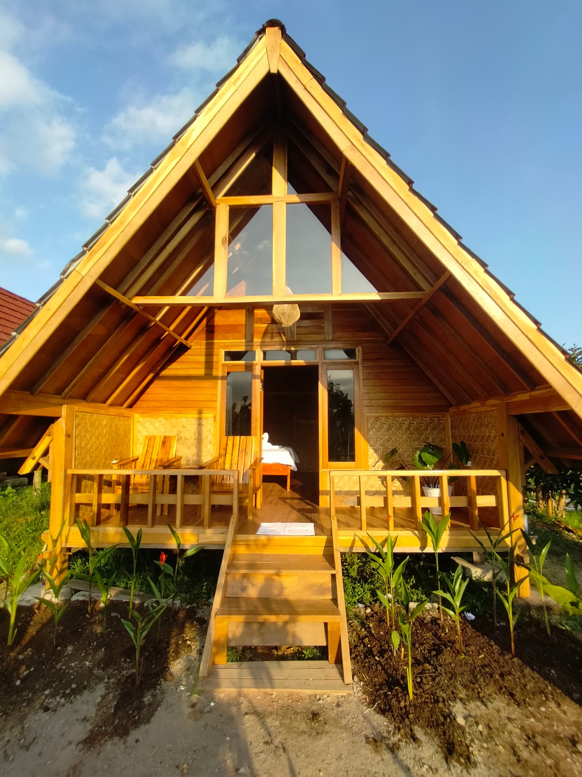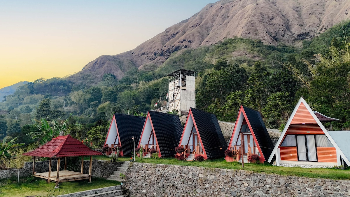 A functional A-frame cabin located in Sembalun Lawang, offering direct mountain views from your private space. Each unit features a private bathroom with a bidet, a tea/coffee maker, and a dedicated seating area. Guests have access to an on-site restaurant serving Indonesian cuisine and a shared terrace for relaxing outdoors. The property provides free private parking, room service, and WiFi throughout the premises.