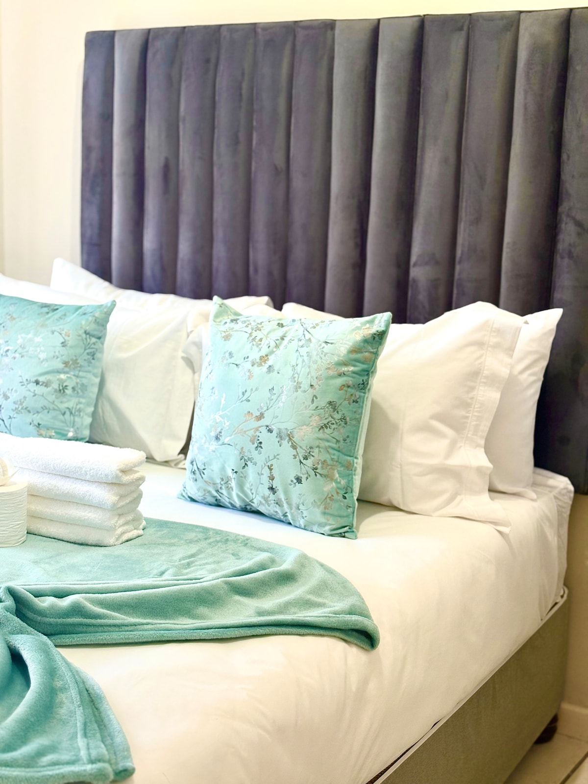 Modern, spacious 2 bedroom flat with its own private braai area. Neat fully equipped self catering flat ideal for business travelers, couples and family on vacation. It is secure and close to shops and restaurants. We offer full DStv and uncapped WiFi.