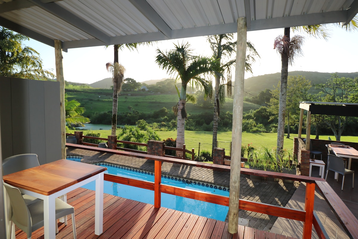 Located on the banks of the upper Nahoon River, Farm View offers accommodation in the quiet suburb of Dorchester Heights in East London. Ideal for short stays, the guest house has self contained suites (self catering) which offer neat modern finishes in comfortable surroundings and boast secure offstreet free parking. The suites have access to an outdoor relaxation area set around a pool and braai area overlooking the river and neighboring farm.