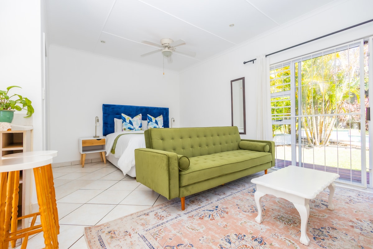 Situated in a quiet, tree-lined road in Nahoon Mouth. Our open plan guest cottage offers a queen sized bed with high quality cotton linen, uncapped wifi, a HD smart tv, full DSTV & battery backup for load shedding. A well equipped kitchenette with stove and oven makes self catering easy. For those who enjoy walking and running, we are a short 2km away from Nahoon river and beach. Spar and a selection of great restaurants and coffee shops are also a short walk away.