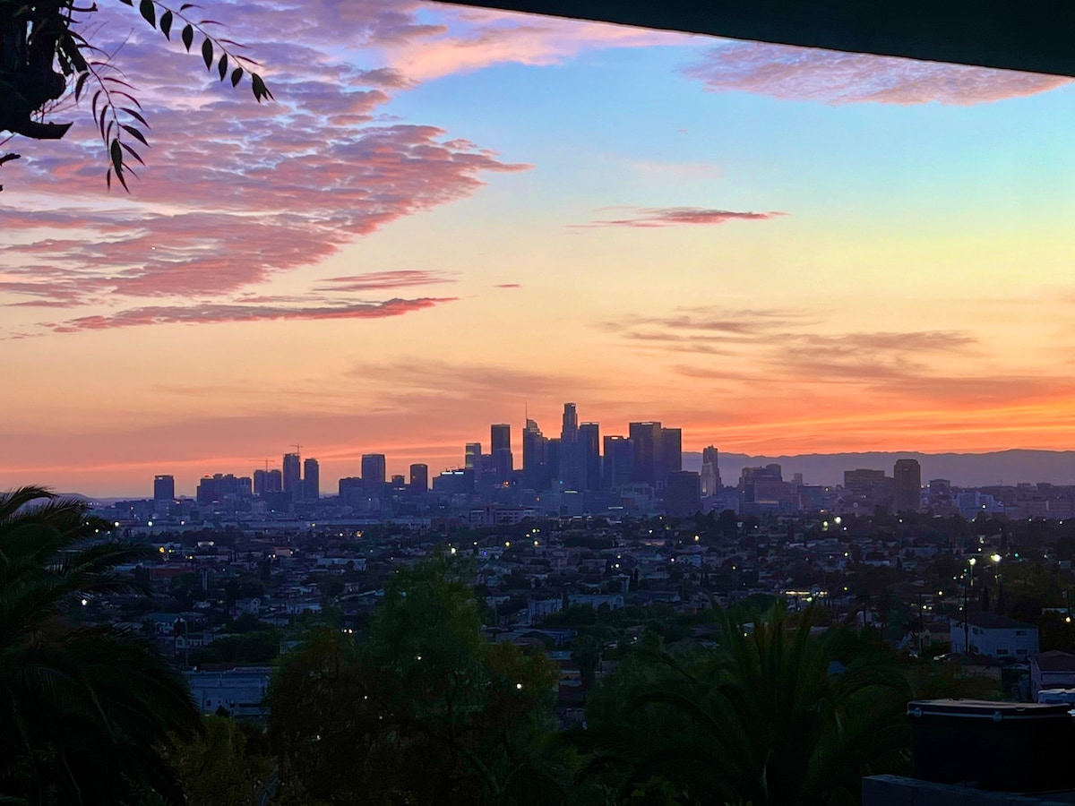 Newly renovated downstairs studio with private entrance/outdoor patio + garden, Studio Yuzu is perfect for a solo traveler or couple: super-comfortable queen-size bed, small sitting area with reading chair & sofa, workspace with high-speed wifi, small kitchen, washer/dryer, and a gated parking spot for one car. Sweeping views of the San Gabriel Valley from this ground-floor hillside home. Hosts live upstairs, giving you all the privacy you need. Only 8 minutes by car from DTLA (downtown LA).