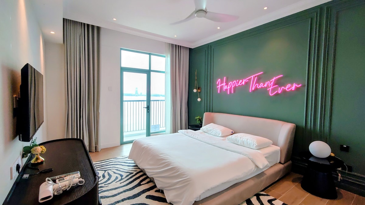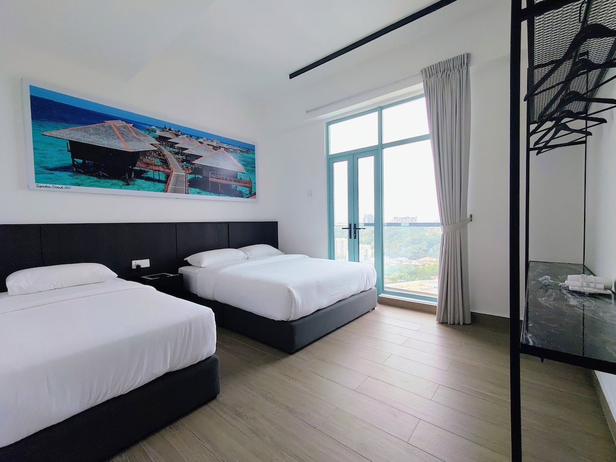 💡 安全起见不提供熨斗,但可应要求提供挂烫机 🌊 15楼绝佳海景两居室,带私人阳台,尽览里卡斯湾、神山、哥打京那巴鲁清真寺及敦慕斯达法大厦全景。 🛏️ 卧室配置: - 主卧室: 配备2张双人床 - 次卧室: 配备2张单人床(无窗) 🚿 便捷设施: 两间卧室均带独立卫浴和开放式衣柜。 🛋️ 舒适客厅: 配备舒适沙发与55英寸智能电视。 🍳 简易厨房: 操作台配备炉灶、抽油烟机,并提供厨具与杯具。 🍽️ 用餐区: 配有一张双人餐桌。 ⚡ 高速WiFi覆盖全屋。