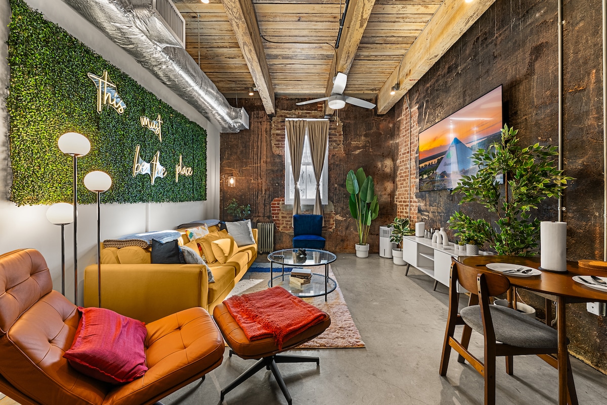 Discover the rhythm of Memphis in this upscale 2-bedroom loft just steps from Beale Street. Once a historic warehouse, now a designer retreat, it pairs exposed brick and polished concrete with warm amber, blue, and green tones. Snap photos by the neon grass wall, unwind in your private arcade or ping pong lounge, and enjoy access to a premium gym. A luxurious space to cook, connect, and create lasting memories in the heart of the city.