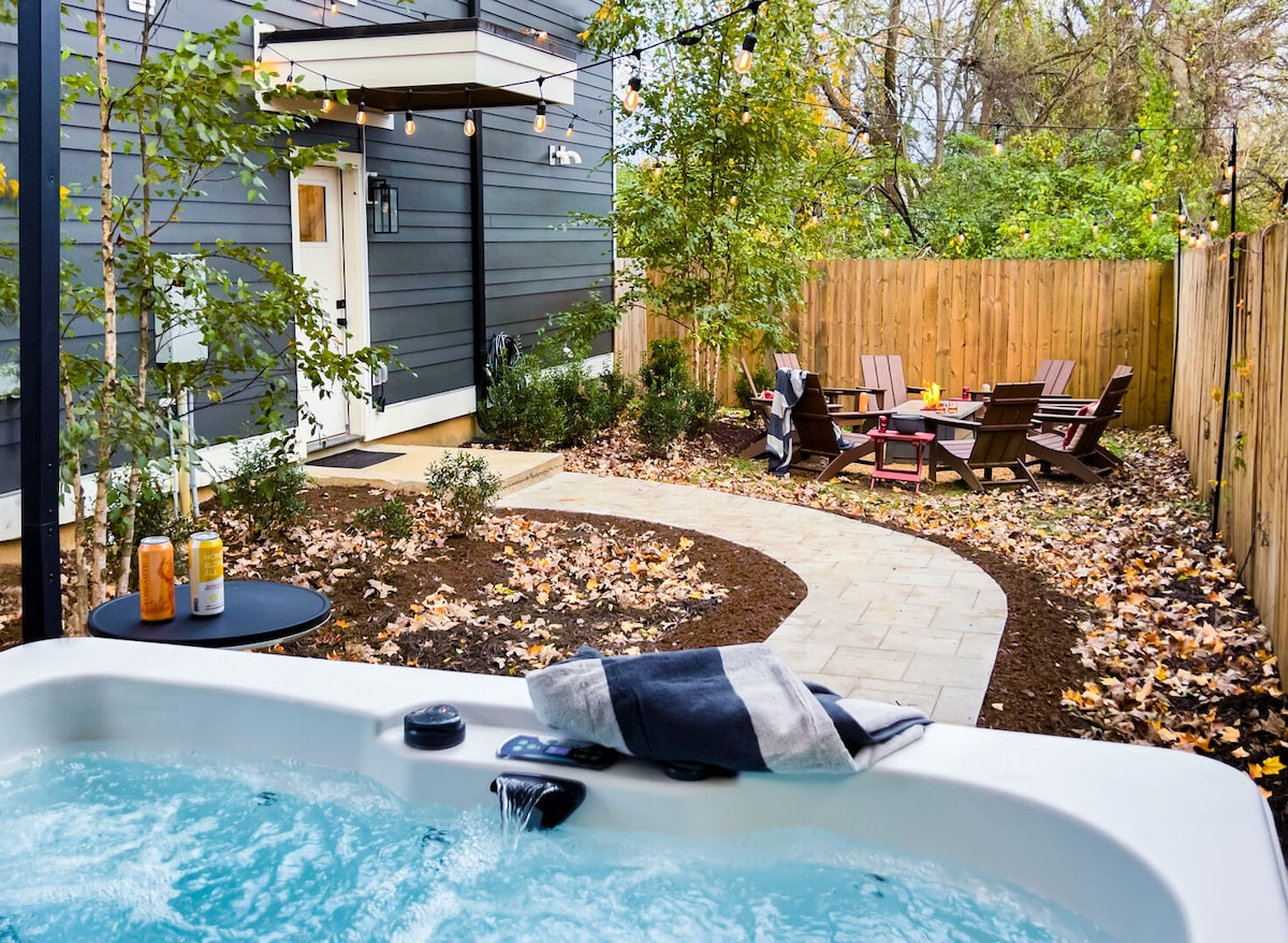 This custom-designed East Nashville guesthouse is perfect for exploring the city! Just 15 minutes from the airport with ample parking, it's a 25-minute walk (or $5 Uber) to East Nashville's 5-Points and $10 to the Honky Tonks. The interior has been recently refreshed, and the home sleeps up to 6 in the 1 bedroom plus loft. As of Oct. 2024, enjoy a newly-designed outdoor courtyard-no expense was spared! It features a covered hot tub, fire pit, TV, and more. Perfect for fall & football.