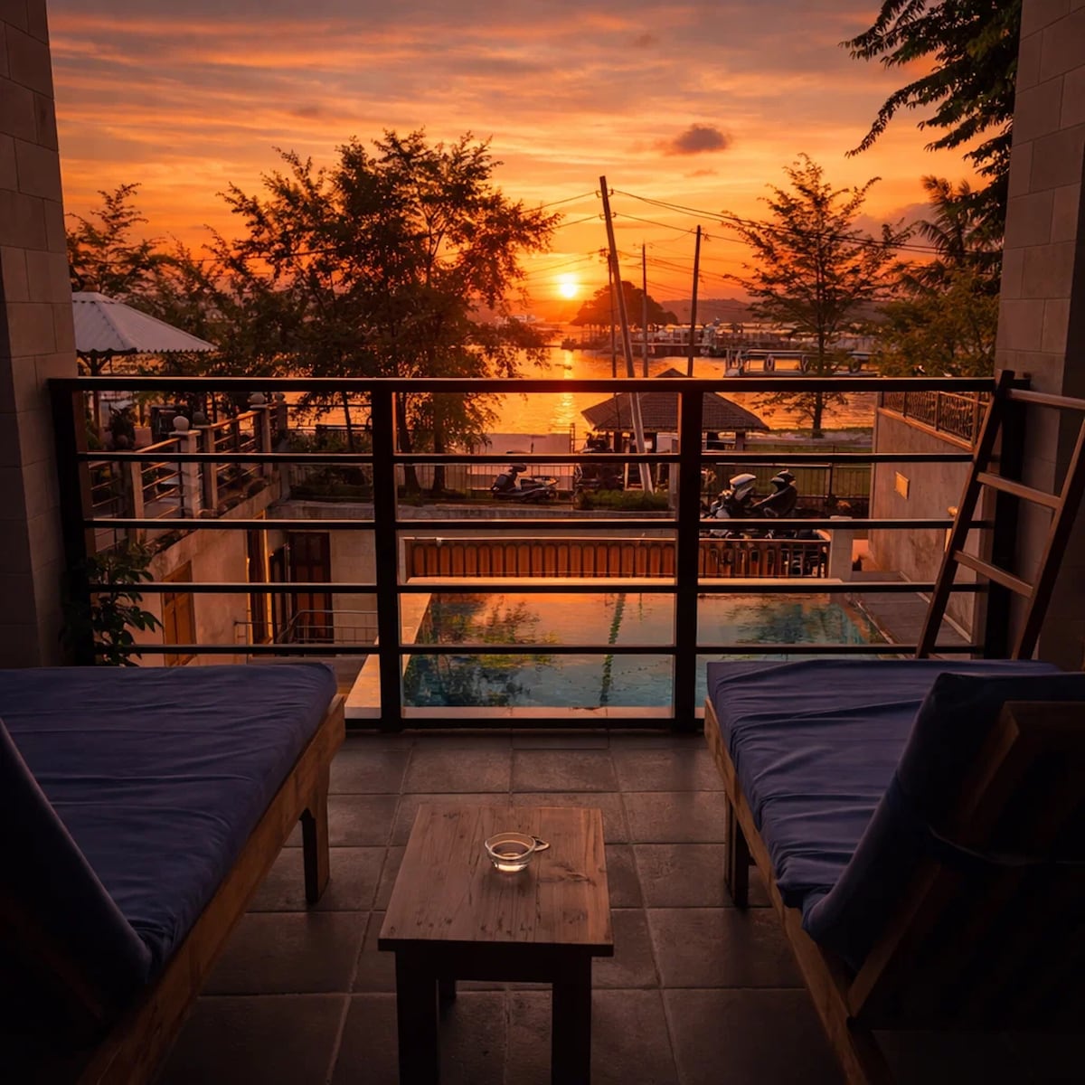 Experience stunning hill and sea views at Green Hill Boutique Hotel's Hill Sea View Room. Enjoy modern comforts with AC, a flat-screen TV, water heater shower, private balcony, safety box, and hairdryer. Perfect for a relaxing and convenient stay in Labuan Bajo.