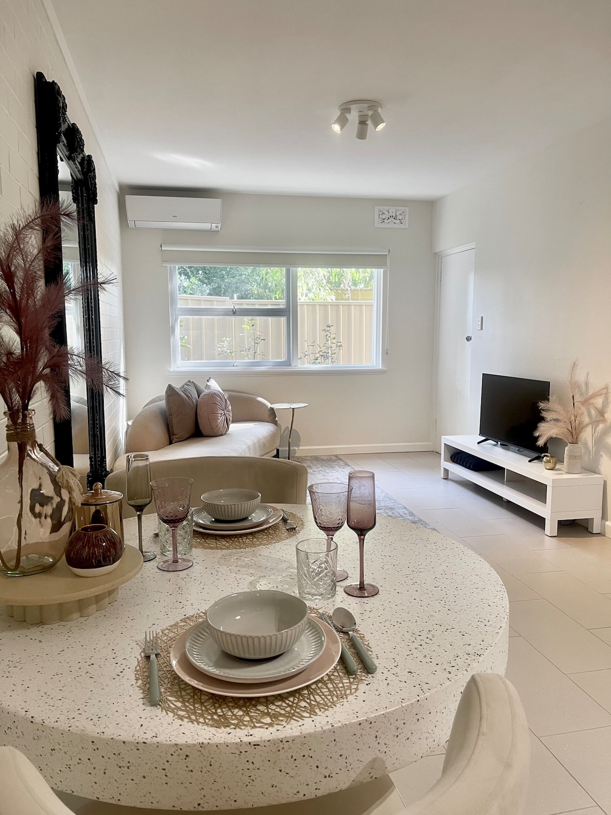 Beautifully presented spacious & modern 1 Bedroom (queen bed + king single floor) 1x bathroom, fully furnished apartment conveniently located walking distance to the River Front and cafe, with access to kayaking, swimming, bird life, large sunsets & public transport, 2 x car bays also. Large Open plan Living/Dining area opening out to a private courtyard, Modern Kitchen, washing machine , gas heater and air conditioned! Peaceful, clean, secure and ultra modern decor that’s 15min to air