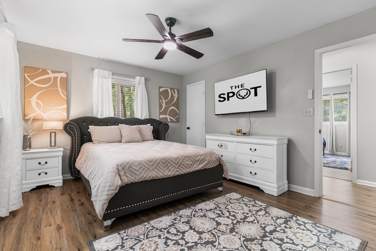 🎮 Play, Relax & Recharge at Greywind Retreat—an open‑concept Atlanta home with modern style and NEW hardwood floors. Sleeps 10 with a premium King mattress, oversized hybrid water heater, fireplace, Smart TVs & an arcade loft for throwback game nights. Near ✈️ & Convention Center; perfect for families or work trips with fast internet & office/printer. 🛏️ Sleeps 10 🎮 Arcade Loft 🪵 Natural Hardwood Floors ⚡ 1‑Gig Wi‑Fi 🖥️ Office + Printer 🍳 Full Kitchen 🔑 Self Check-In 🅿️ Free Parking