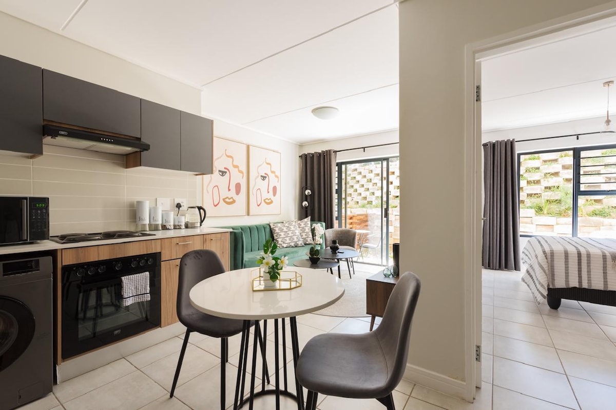 15 Min from OR Tambo. This chic black-and-white space, in a secure gated complex, offers a perfect blend of comfort and convenience. Enjoy a dedicated parking spot, lock-and-go lifestyle, and remote gate access. With a luxurious queen bed and double bed, office space, and high-speed Wi-Fi, it’s ideal for work or relaxation. The fully equipped kitchen includes a gas hob and dishwasher. Relax on the cozy balcony and enjoy premium furniture, bedding, and dining essentials.