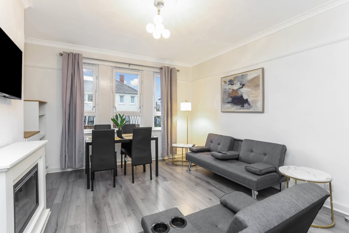 Welcome to your stunning getaway in Glasgow! - 2 beautifully decorated bedrooms with comfy beds - Vibrant area close to boutique shops, bars, and restaurants - Just a 2-minute walk to Giffnock train station for easy city access - Relaxing bathroom with a lovely bath for peaceful soaking - Dining table perfect for gatherings, accommodating up to 4 guests - Abundance of local parks including Queen's Park for outdoor enjoyment
