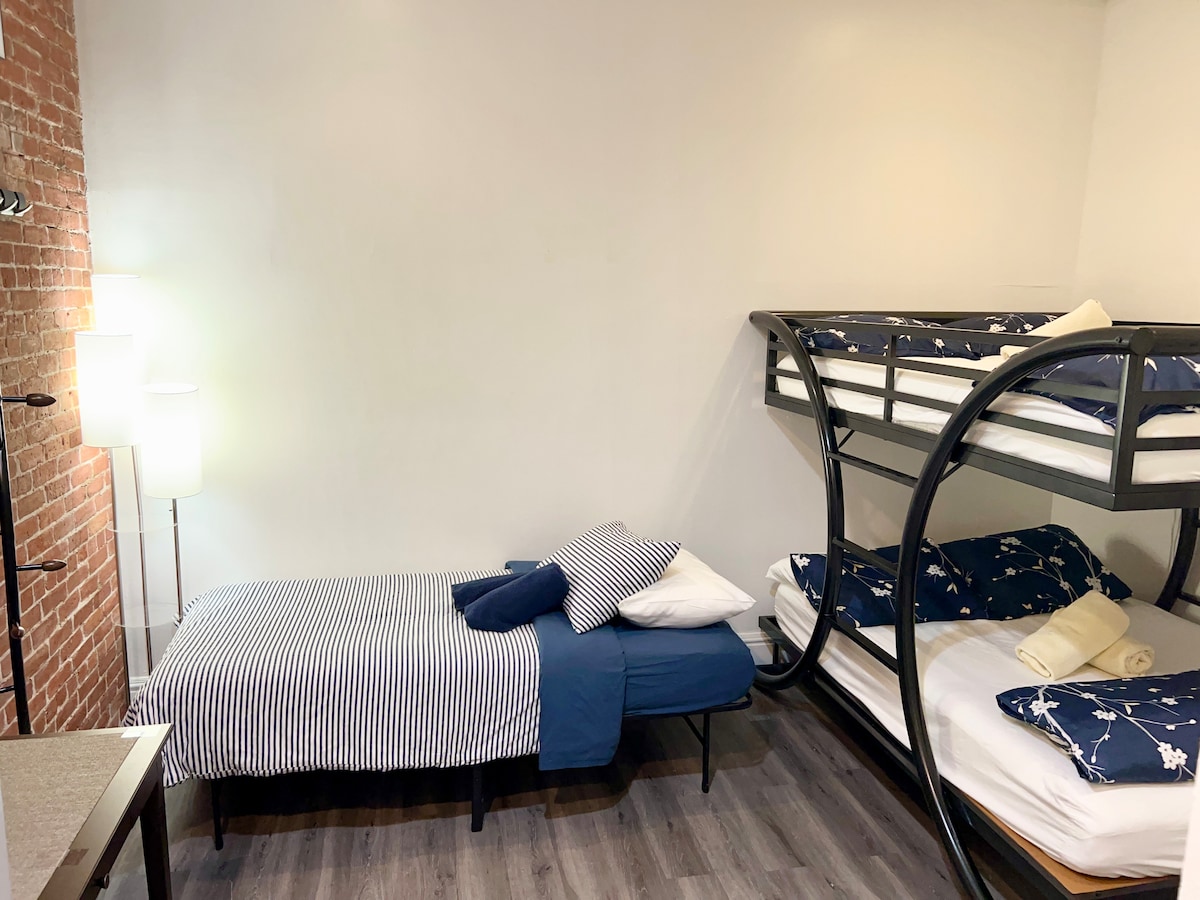 Forget your worries in this spacious and serene space. Private 2BR apartment 3rd floor walk-up building. Features five foot windows with lots of natural sunlight. Located on a quiet/safe tree lined street in historical Harlem. Easy commute to anywhere in New York city. around the corner from the 2 & 3 subway. Private apartment with own bathroom & kitchen. Accommodates 5 adults and a small child /teenager comfortably. Outfitted with 2 beds as well as an IKEA sofa bed. Very clean and safe place.