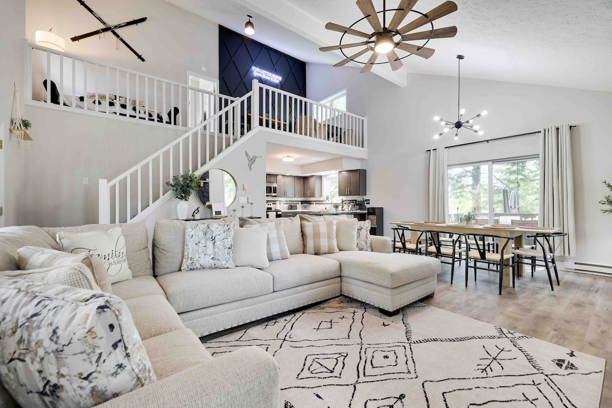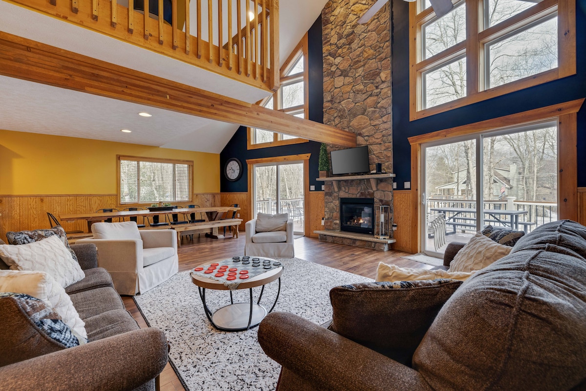 宽敞的度假木屋-步行2湖/滑雪山/火坑/热水浴缸/游戏