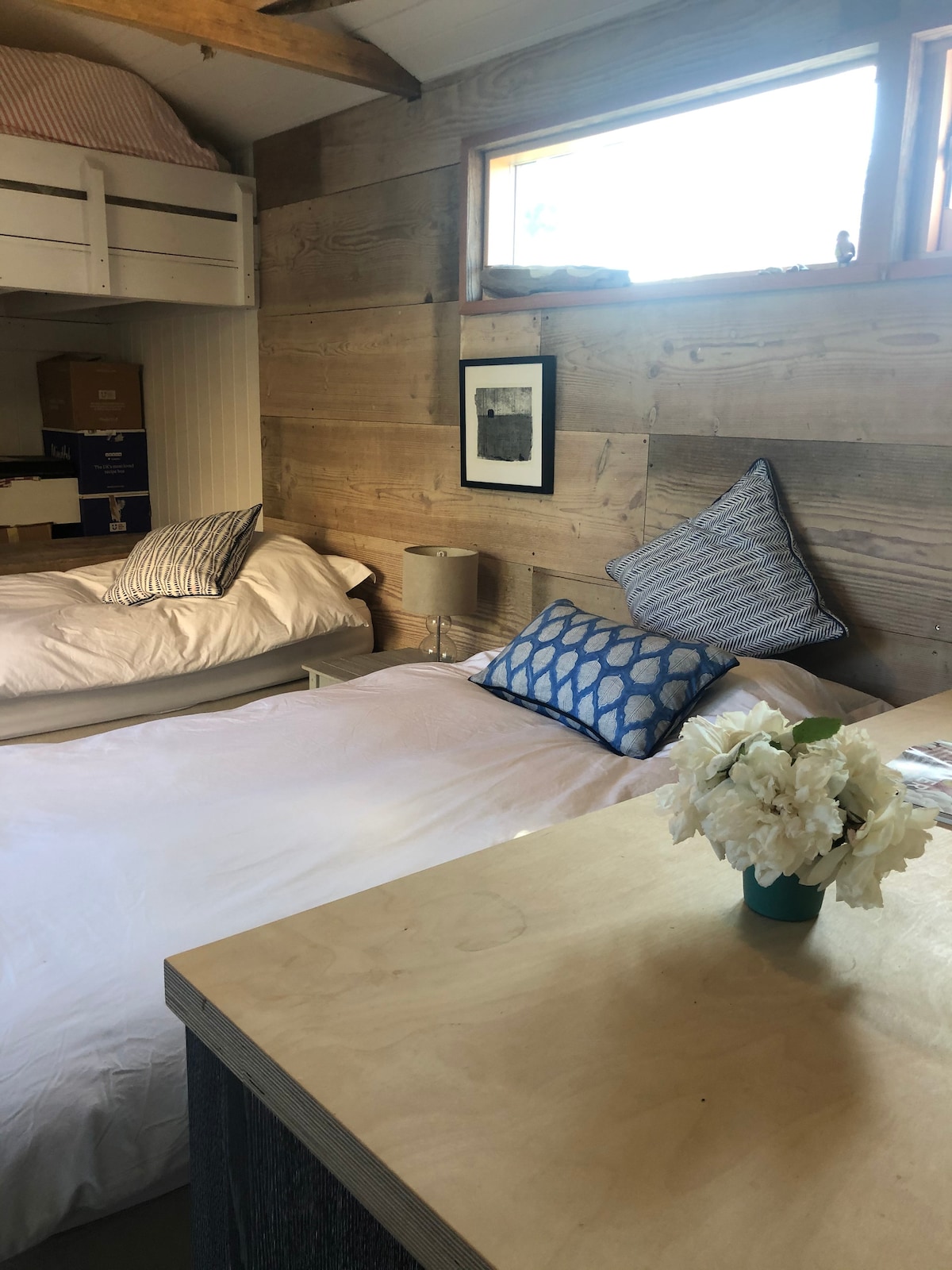 Unique self built studio cabin in a peaceful setting only a stones throw away from the Nature Reserve - replicating the well known Red Hut in Rye Harbour. PLEASE NOTE : The wc/shower room is a separate building adjacent to the main hut. The sink area is also outside the hut. There’s a patio area which looks towards the Martello tower (The enchantress)
