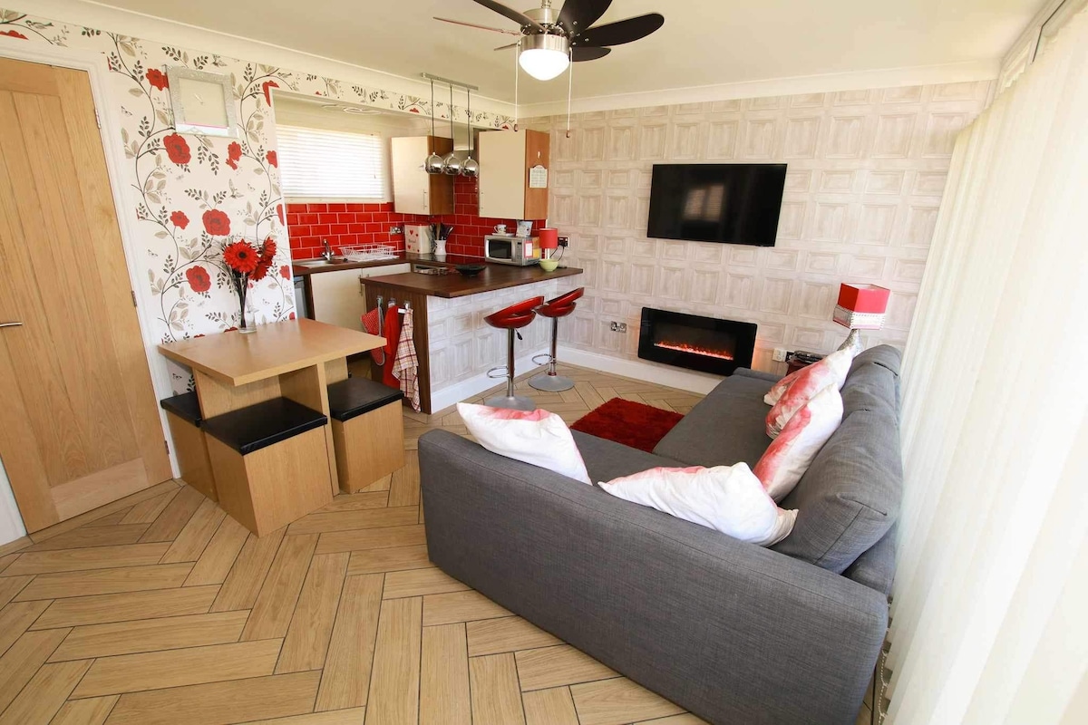 Suntrap- Beachlovers paradise! Great London links! Small families and couples will be in their element! Situated across the road from Cambers 7 miles of glorious, golden, sandy beach and dunes on the popular beach. This well equipped, comfortable south facing, privately owned chalet is situated in a peaceful location, overlooking a green. Includes 2TV's including 43" SmartTV, Free Wifi, mounted fire, lounge ceilng fan, bed linen, hand & tea towels, outdoor table & chairs.Welcome box