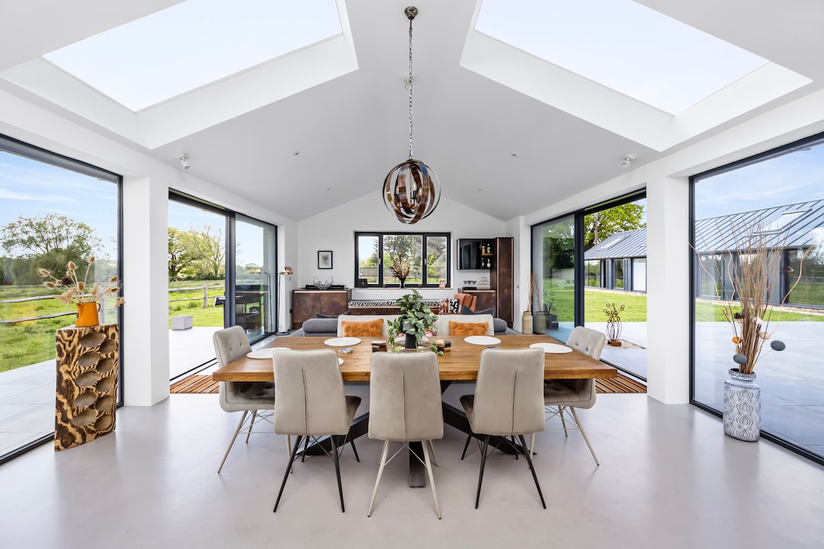 Experience contemporary countryside luxury in this biophilic retreat, set within 2 acres of paddocks, orchard, and wildflower gardens. Designed with open-plan elegance and direct access to the South Downs National Park, it’s the perfect escape for entertaining, relaxing, or reconnecting with nature. -4 bedrooms (2 kings, 1 emperor suite, 1 twin with small doubles) -Gourmet kitchen -Indoor-outdoor living -Dedicated office space & high-speed WiFi -Private gym -EV charger -Parking -Dog-friendly