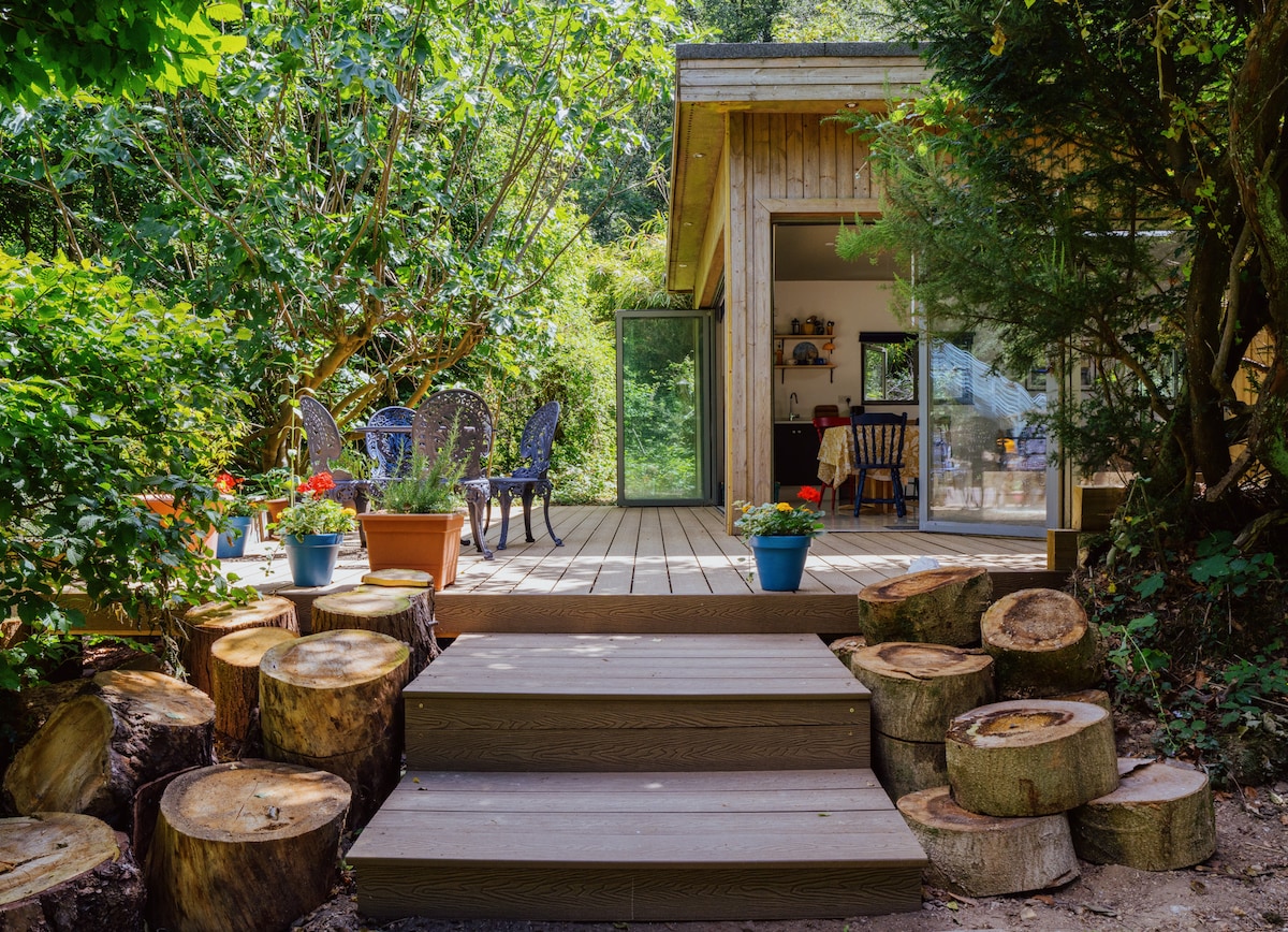 Enjoy a revitalising stay in the heart of Ashdown Forest at our cosy wooden outbuilding! We have two kingsize beds (only one is pictured as we havent updated our listing photos quite yet), one comfy double sofa bed (for groups of 5-6), 1.5 acres of garden, gates to the forest, a children's play area, private terrace, firepit, all the toys and kid amenities you could want (including a full size table tennis table) and an idyllic deck at the bottom of the garden which traps the sun at sunset...