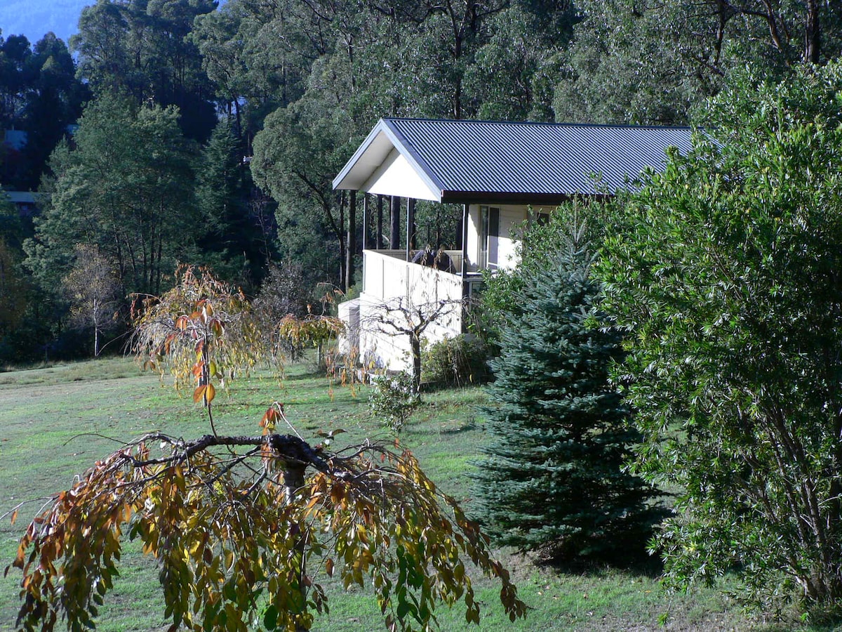 Private, peaceful one bedroom cottage a few minutes drive from Warburton Township, for your exclusive use. A sun dappled half acre block with gardens of European and Australian plants, mountain ash and tree ferns, and lovely mountain views. Amazing native birds and animals with very sociable parrots. Close to the Redwood Forest and Bodhivana Buddhist Temple. Rail Trail, Mountainbike Trail and O'Shannassy Aqueduct Trail nearby for walking and cycling. A genuine family owned and run holiday house.