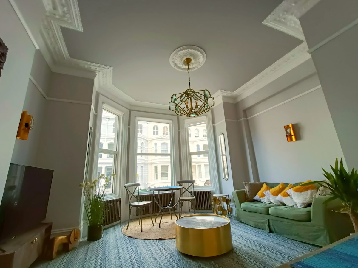 A well appointed ground floor apartment next to the sea with a seaview, with the sea just 10 metres away, a well appointed one bedroomed, a bathroom with bath & shower, Large lounge with original features and high ceilings including Victorian cornice, walking distance to the tennis, theatres, pubs, restaurants, shops in a quiet Victorian building that will sleep up to three guests. Permit paid parking available (these are charged for locally) We also have a sofa bed for one in the lounge
