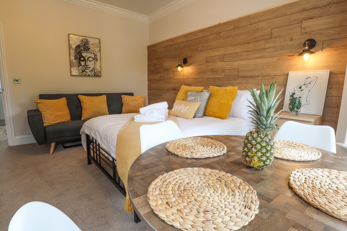 Modern studio flat. Private entrance, modern shower room, open-plan kitchen with microwave, hob, fridge/freezer, washing machine. Double bed, smart TV, sofa, private patio area, parking space. 5 minute walk to town centre, railway station, 10 minute walk to pier/seafront.