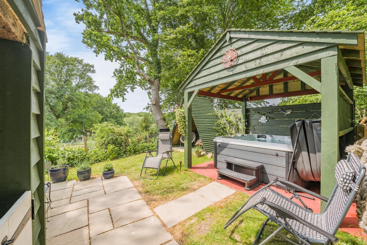 Duck Lodge, a boutique log cabin, is located in a serene village. This all-wood home is surrounded by a lush garden, offering a tranquil location. The well-equipped interior showcases eclectic furnishings, Sky TV and a sound system. Your private 8 seater hot tub is exclusively yours between 4-9 pm located on the main house's patio, 25 meters up from the lodge. To ensure a peaceful experience, we suggest enjoying up to 2 hours of soaking time - perfect for unwinding in comfort and privacy 🥂🍾