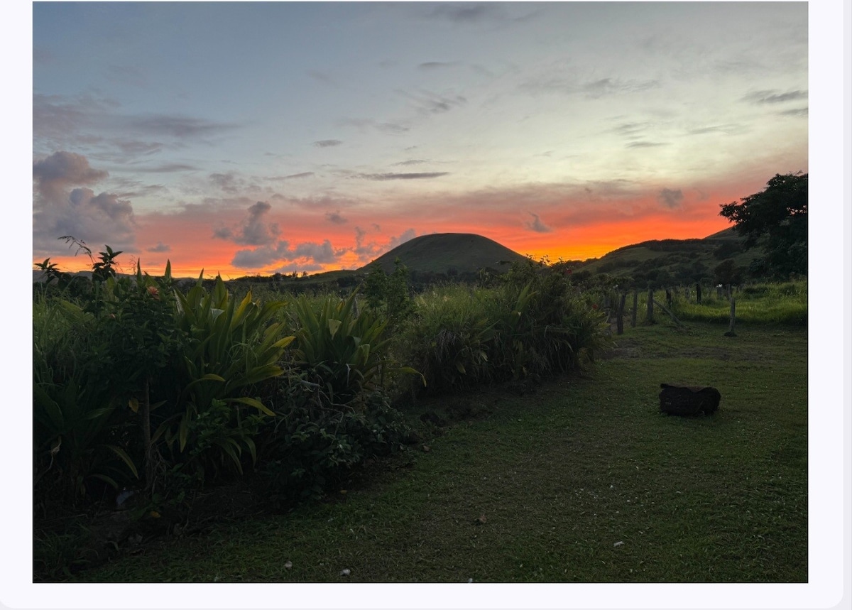 Acogedor hostal a pasos de la avenida principal de Hanga Roa, cercano a comercio, restaurantes, aeropuerto, farmacia, etc. Ideal para llegar caminando a todas partes de la ciudad. Habitación privada, con cama matrimonial y baño en suite.