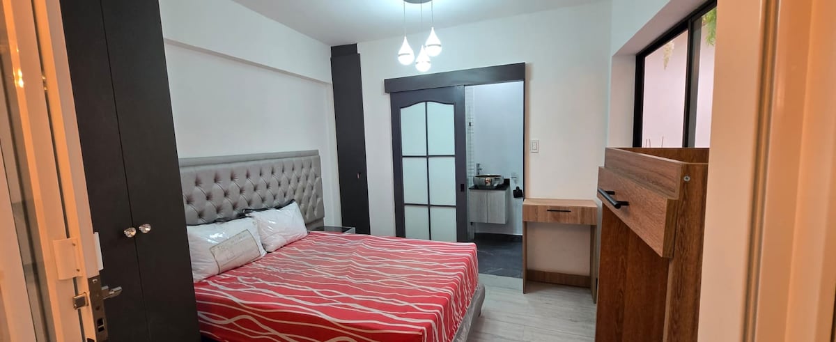 Enjoy a unique stay in this cozy queen room located in the garage area of Soul Lifestyle Apartments. The room offers a comfortable queen bed, a work desk, a private bathroom, a TV, and a coffee maker. Step out onto the small terrace for a breath of fresh air. This space is ideal for guests looking for a budget-friendly stay with all the essentials.spacio para quedarte.