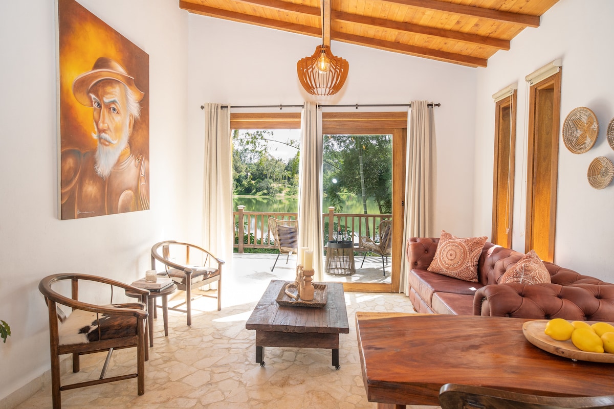* The lake levels are back & the docks are floating! * Experience the awe-inspiring Arc House, an architecturally designed gem on a private bay, just 10 minutes from Guatape. Glass walls, 20-foot ceilings, and panoramic nature views make it truly unique. The house features 2 queen bedrooms, ensuite bathrooms, balconies, and a sofa in the living area to accommodate a total of 6 people. The high-quality kitchen is a chef's dream, complemented by a dining table for 6 and a lake-view balcony.
