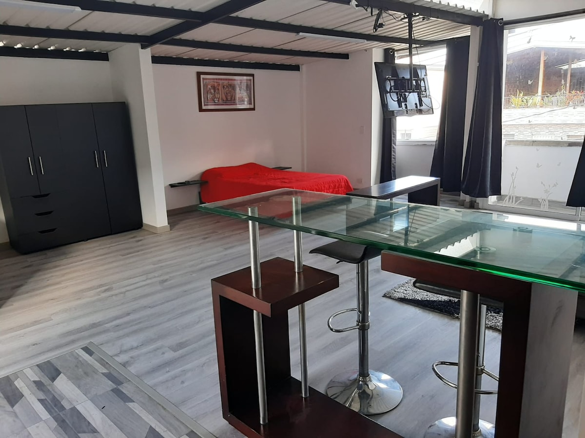 Barrio Manrique a 4 km del centro (12 min), zona socio económica clase media. Cerca al parque explora, U de Antioquia, U Nacional, Hospital San Vicente, jardín botánico, CC la florida, CC Bosque Plaza. Tenemos a media cuadra una tienda, farmacia, helados, comida rapida. Espacio tipo loft con wifi, lavadora, nevera, utencilios cocina, tv, escritorio, ventilacion, balcon, patio, cama grande, sofacama, comedor tipo barra, closet.