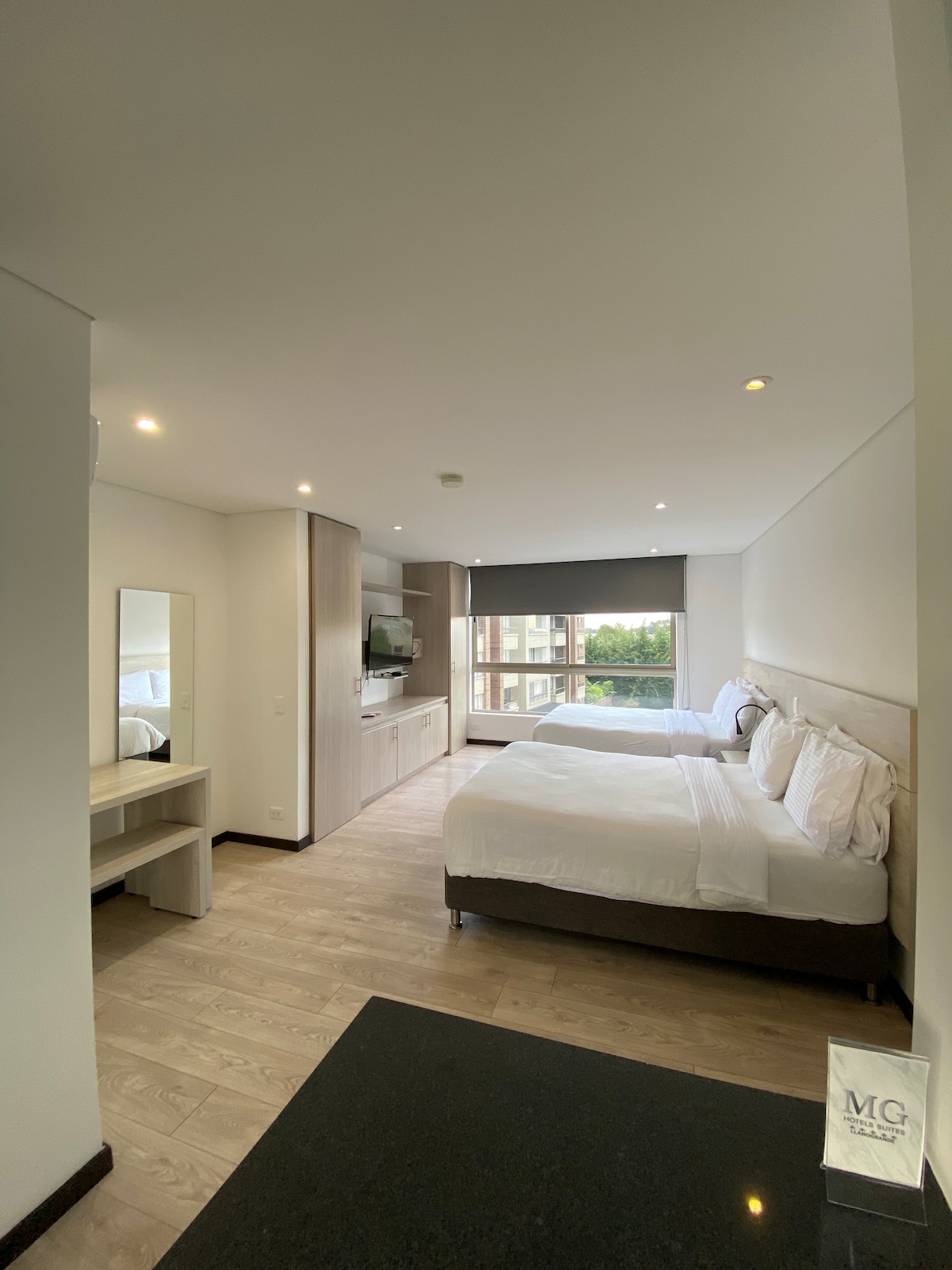 Con un amplio espacio de 23m2, cuenta con una acogedora alcoba, una zona de entretenimento perfecta para relajarte, un balcón para disfrutar de una espléndida vista, cocina equipada, un cómodo escritorio para trabajar; amplio vestier para organizar tus pertenencias, lencería de calidad y un baño completo para tu comodidad. Cuenta con cajilla de seguridad, plancha y mesa para planchado.