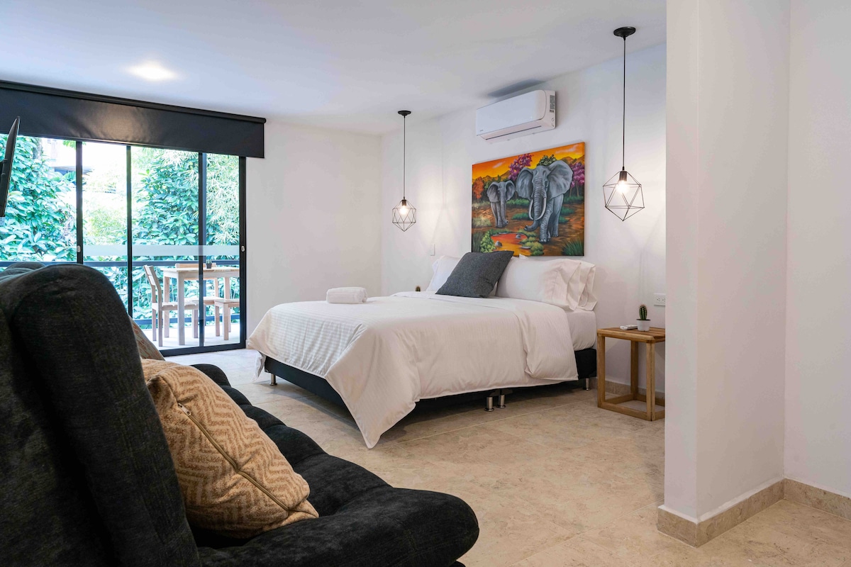 • Amazing location in heart of Poblado: "Oasis in the middle of the best part of the city, walking distance to everything” • Modern, fully furnished Loft • Sleeper sofa • High speed 100 Mb WiFi • Loads of nature around • On-site staff to help you with your needs 24/7 • Air Conditioner • Pool + Hot Tub in the common areas • 5 mins walk to best restaurants, cafes, malls. 15 mins walk to Poblado and Lleras Park • Fully stocked kitchen with appliances • 43” Smart TV with Apps • Transparent prices
