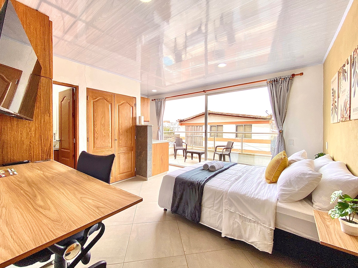 Suite completamente amoblada de 28 m2, con aire acondicionado y cocineta. Ubicada en una de las mejores zonas de Medellín, en un barrio muy tranquilo y cerca de todos los sitos de interés. La Suite cuenta con una vista espectacular a la ciudad y a las montañas. Podrás hacer uso de la zona de coworking, gimnasio y un espectacular café que ofrece diferentes tipos de bebidas a base del mejor café colombiano, podrás disfrutar de tu bebida en la terraza que se encuentran en el 2do piso del edificio.