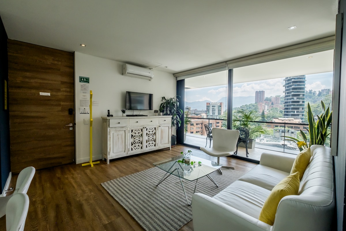 Beautiful Studio with a wonderful view of the mountains. It has a balcony with breathtaking views. Stay connected with our 300 MG stable wifi for working and enjoy your favorite shows on the smart TV. We have king size bed and washer. 24/7 Check in and security Pool and Gym in the building *Zero tolerance against sexual tourism. *Please see our house rules. * If you are Colombian you must pay IVA 19% additional.