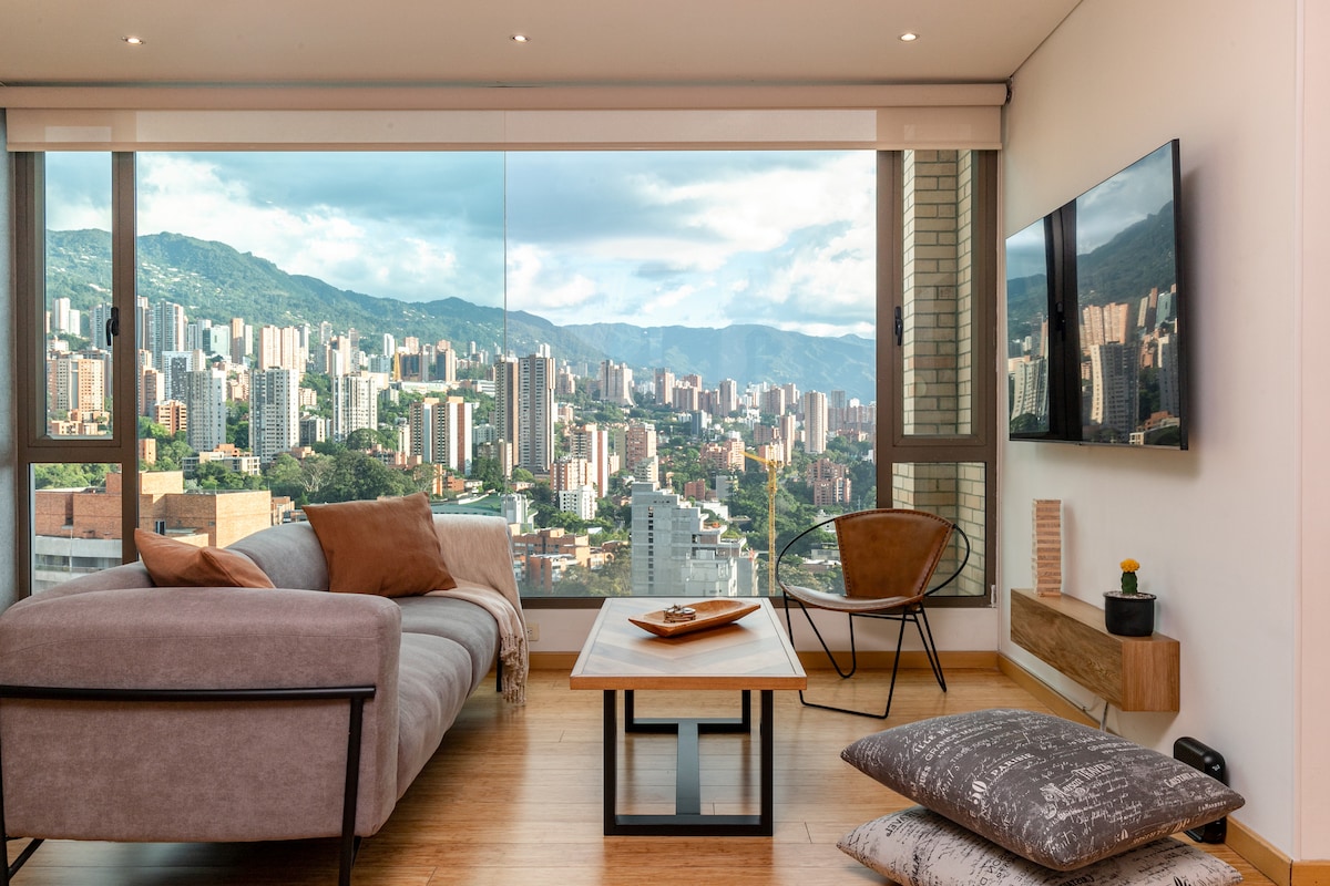 RECENTLY RENOVATED -High-speed internet great for remote work -Brand new A/C -Fully renovated Industrial design apartment -King size bed -Breathtaking views of Medellín (trust me, worthwhile to stay here) -19th floor -Unbeatable location in Poblado near to Provenza and Lleras Park -Modern amenities -Spacious living area -Smart TV x 2 -Fully equipped kitchen -Washer & Dryer Tower -Pool -Gym -Coworking space -Restaurant inside the building -Private parking -Self check-in -24/7 Security