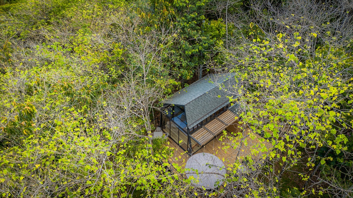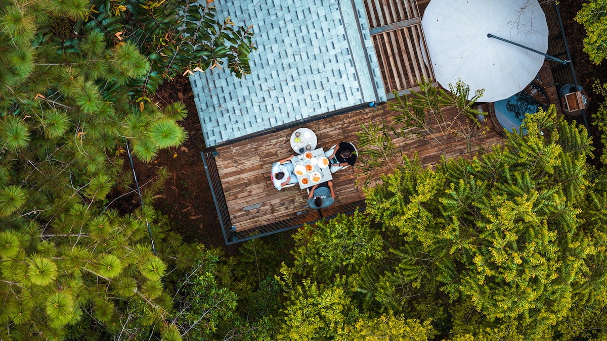 Un espacio rodeado de árboles de Melina que atraen aves y fauna silvestre, ideal para quienes disfrutan escuchar y observar la vida del bosque.Vista directa al bosque a través de ventanales de piso a techo. Tina de agua caliente estilo ofuro japonés , perfecto para relajarte en privacidad. Mezanine acogedor para huéspedes adicionales o para tu descanso y lectura. Malla de bote interior, pensada para relajarte con la vista del bosque. Ducha con agua caliente y vista panorámica al entorno natural.