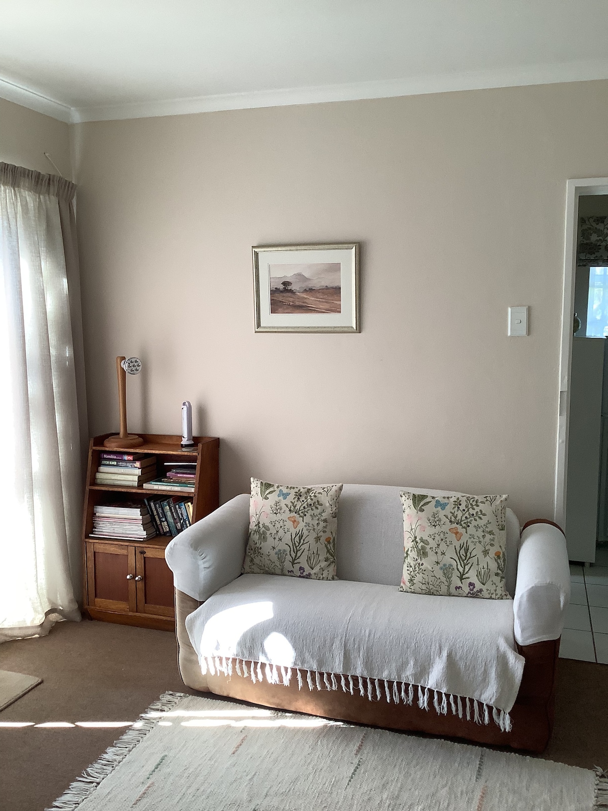 NO SMOKING INSIDE,PLEASE. This is an open plan self-catering unit with it’s own entrance. It is light, airy and is pleasantly decorated. It has a separate toilet, hand basin with a shower above the bath. The kitchen is fully equipped with gas stove, microwave, fridge/freezer, washing machine, kettle, toaster, cutlery, crockery, pots, pans and all utensils. There is a small working space and constant wifi is available. There is also secure off road parking. SOLAR POWERED!! No more load shedding
